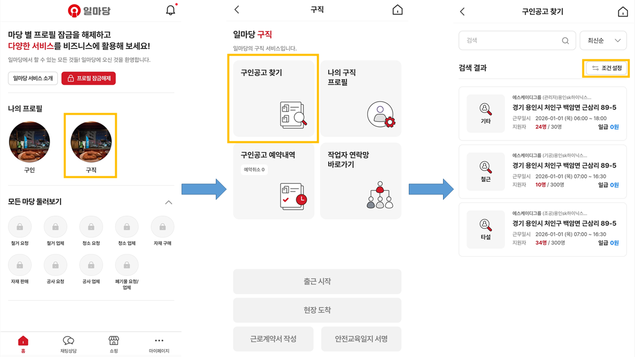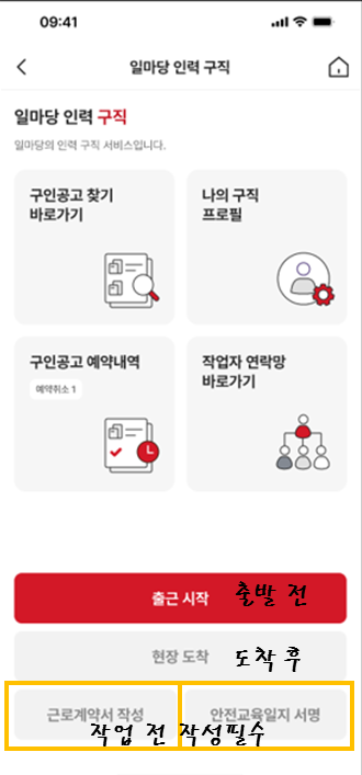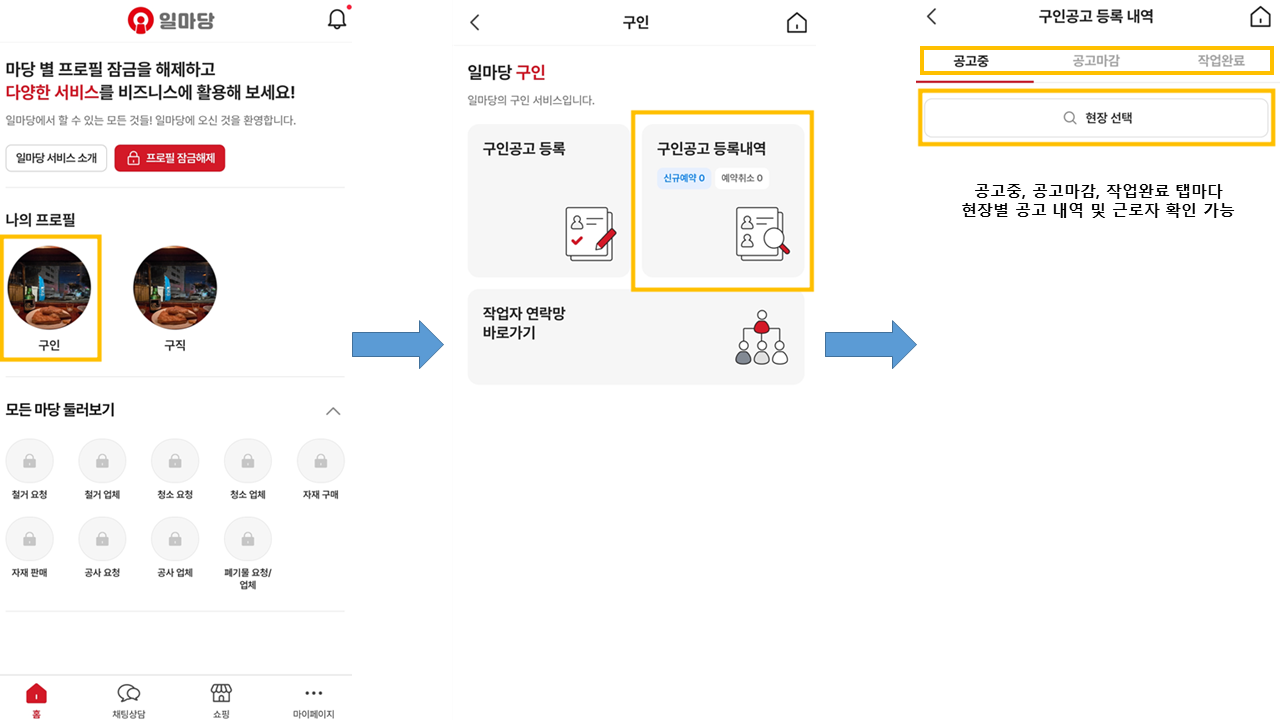 1. 마이페이지 → 현장관리 → 현장등록 → 구인 프로필 → 구인공고 등록