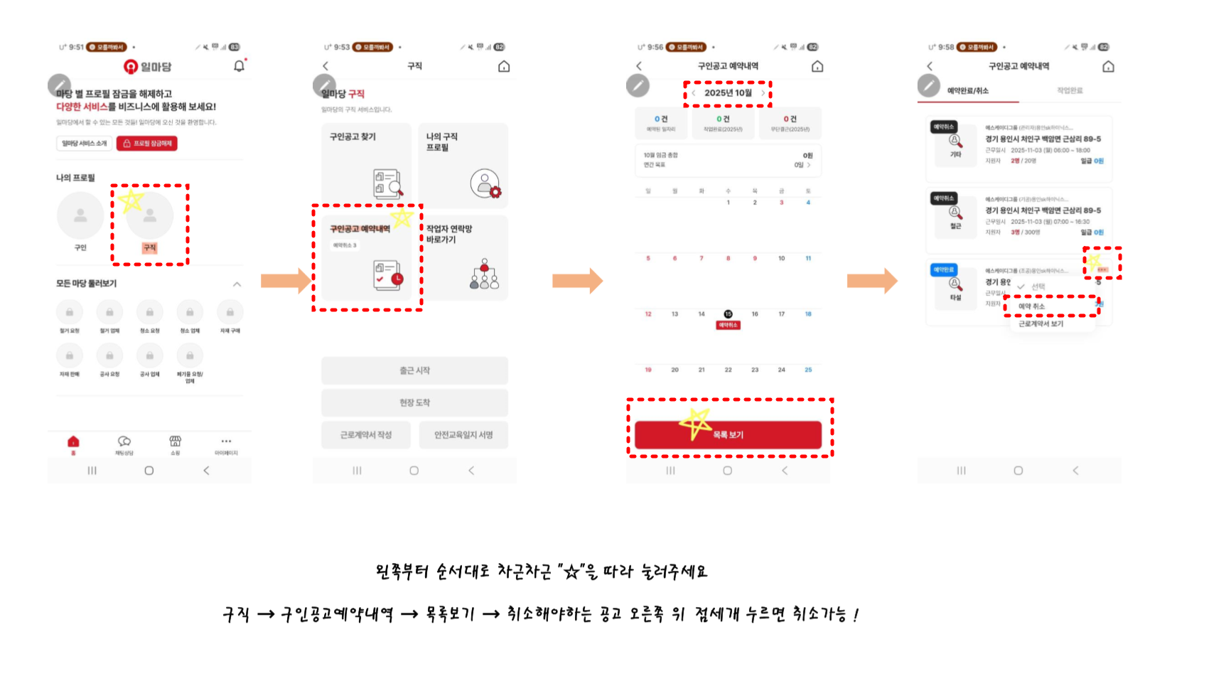 * 예약취소 가능 시간은 당일 또는 익일 공고는 예약 후 30분 이내 또는 그 외의 경우, 근무 시작일 24시간 이전에 가능합니다.